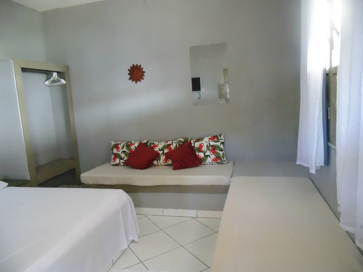 Quarto vista para o mar, com cama de casal, e duas camas de solteiro, frigobar, banheiro privativo, ventilador de teto, armárioario para roupa, banheiro privativo, acessórios básicos: lençol, travesseiro, toalha de banho, sabonete e varanda.
