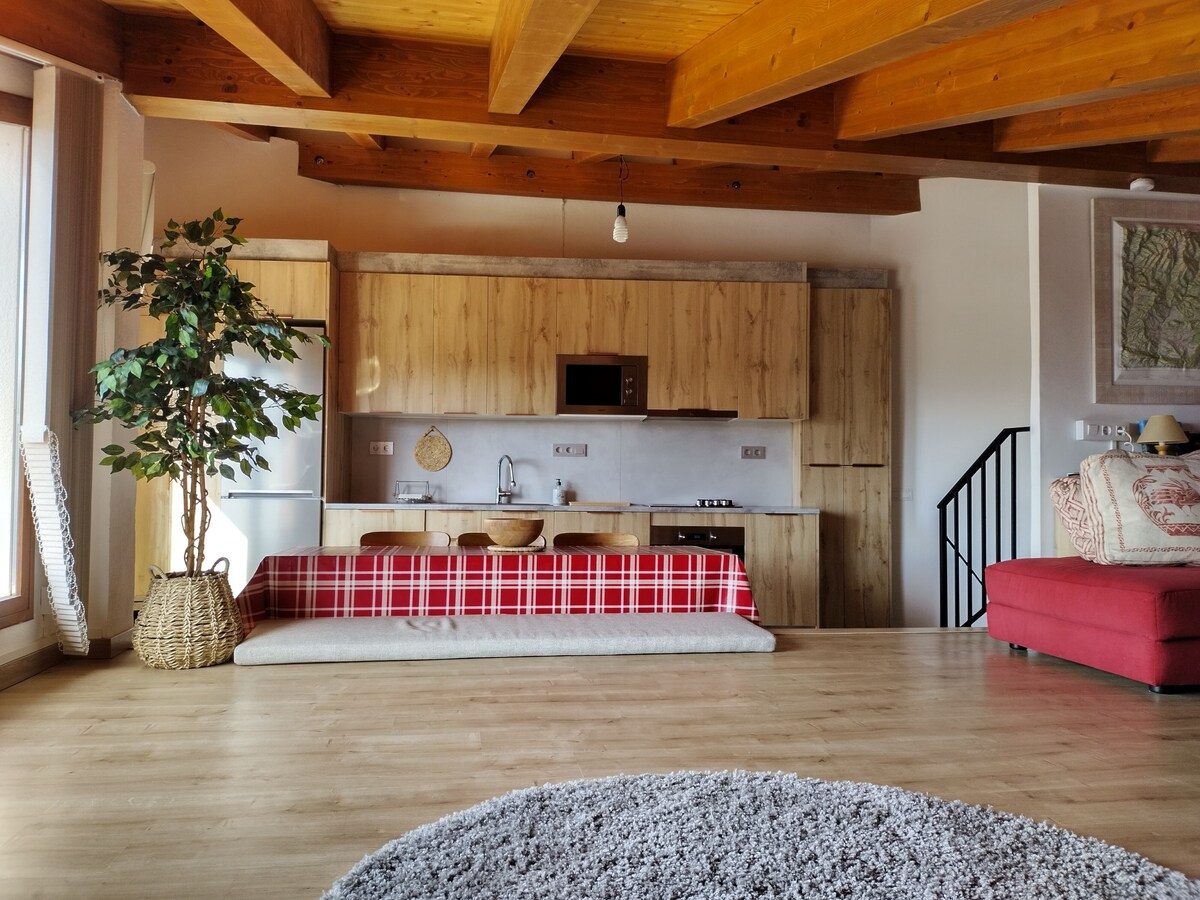 Duplex apartment (Dreta) Free Wi-Fi. Two bedrooms (maximum 5 people), full bathroom, living room with fully equipped kitchenette. Bed linen, duvets and towels are included. SPECTACULAR VIEWS. All the apartments in which the house is divided have free access to the private Terrace-Viewpoint of the accommodation. Park in front of the house. 3km from Vielha and 15km from Baqueira. We have two very similar apartments (Dreta i Esquerra), between the two they have a capacity for 10 people.