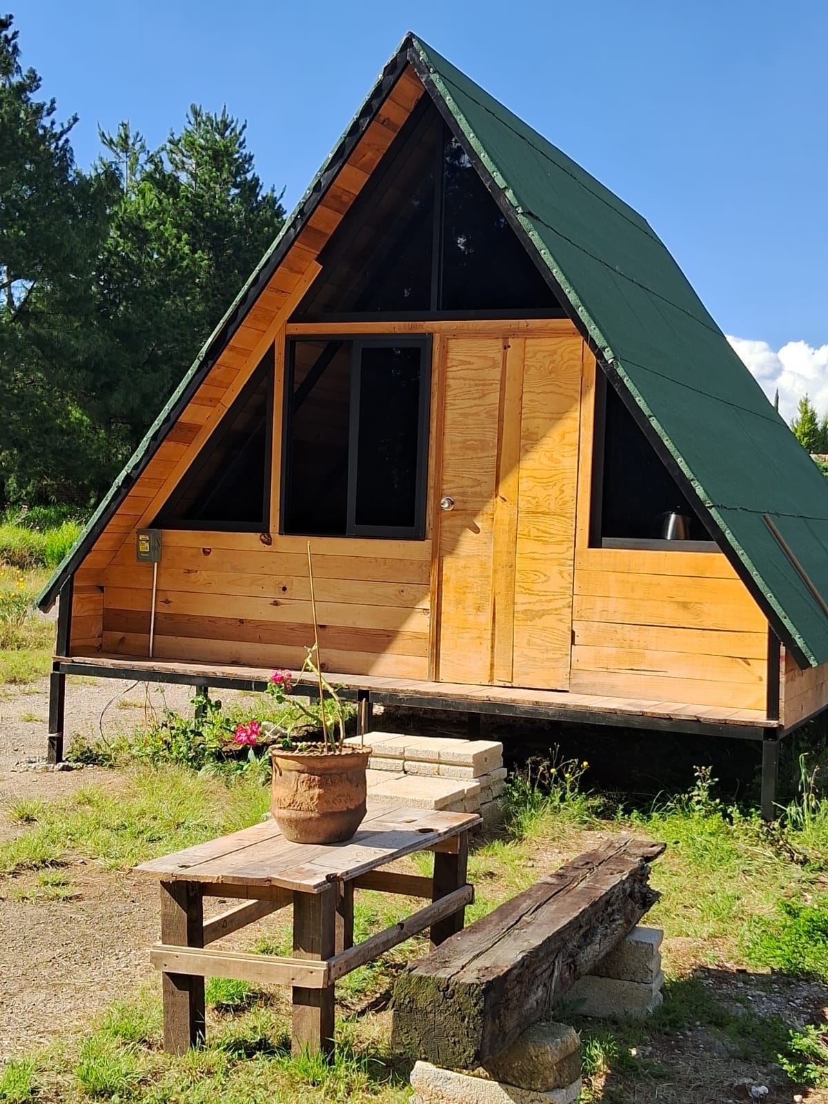 Elevated cabin with a small terrace and forest views. It has two double beds for 4 people, a full bathroom inside, and a dining and barbecue area at the bottom. the activities we have are a hammock and swing area, a fire pit area (charcoal and firewood are sold separately), hiking to a nearby river, and large green areas for outdoor activities