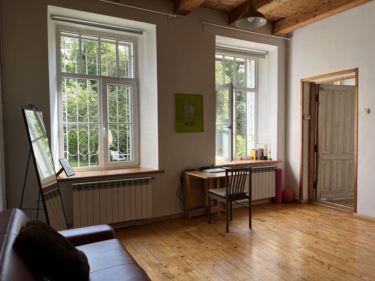Comfortable, spacious, and unique space. Close to an old town, cozy and charming neighborhood next to an art space Sodas 2123 located in Rasos Colony neighborhood. The house was built in 1905, with high ceilings, a private garden, a fireplace, and autonomous heating.