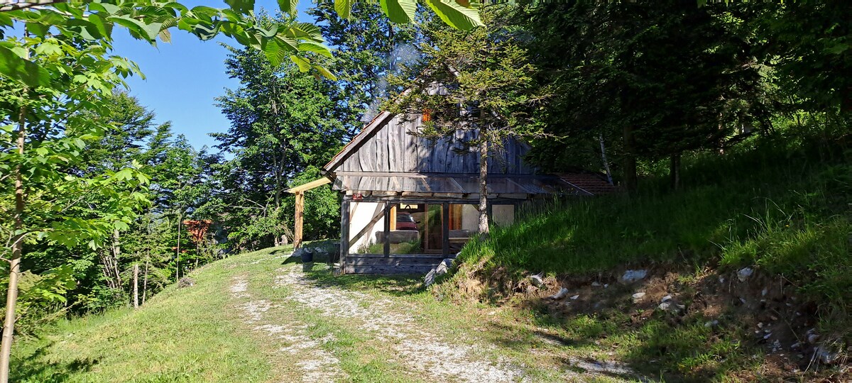 Unique, hand-built cabin made of natural materials. Located in a secluded hamlet among the hills of the Tolmin–Idrija range, at 900 meters above sea level. Surrounded by forest, meadows, and herbs – ideal for rest, disconnection, regeneration, or creativity. Access via a maintained mountain road. The last 4 km are a well-kept gravel road. MAGICALLY NATURAL