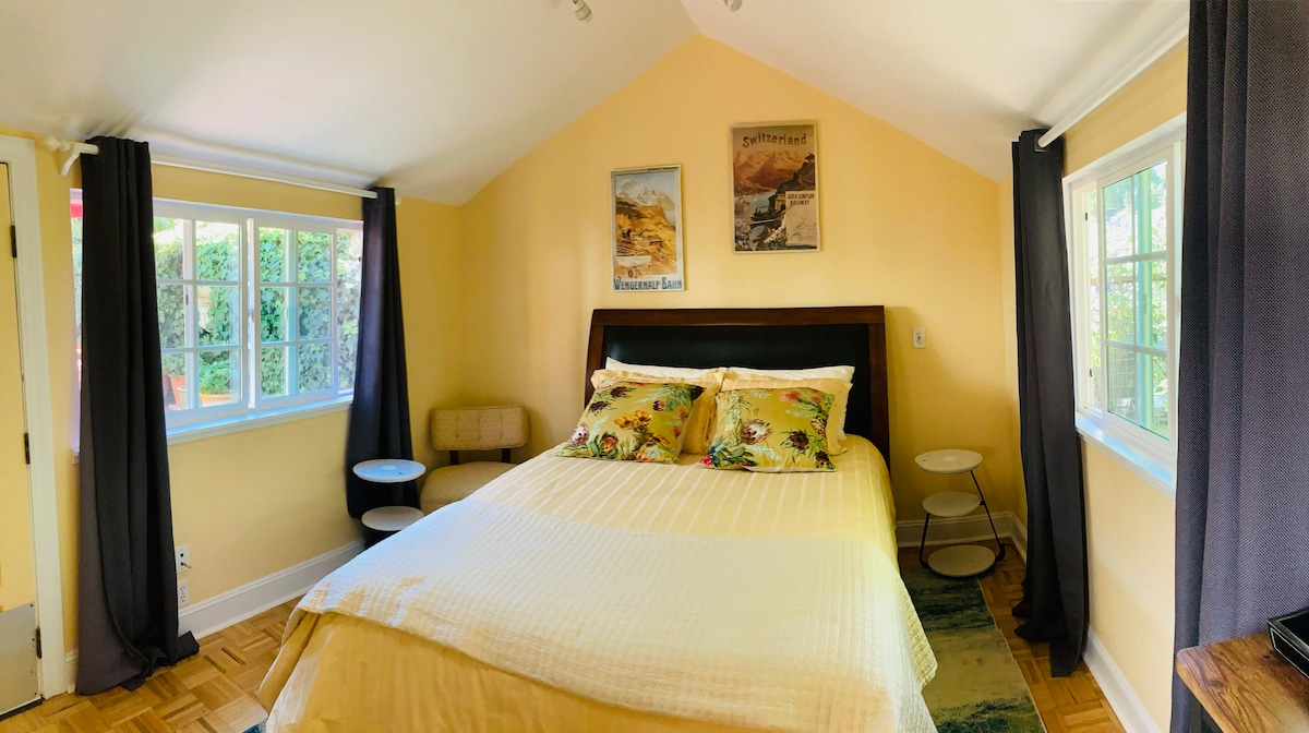 Linger over a coffee in the zen, vine-covered courtyard at this secluded cottage nestled in the back of a period property in Berkeley. Crisp white sheets, craftsman furniture, and painted wooden cladding make for a sophisticated yet rustic haven. The main room is cozy with a big skylight, comfortable queen bed, swivel chair, and desk and chair. There is a small kitchenette. Outside is a stone patio, a swinging bench that overlooks a koi pond, and a small outdoor table and chairs. ZCSTR2021-0842
