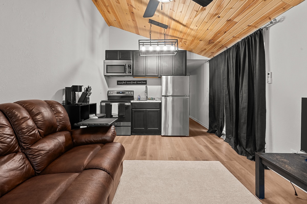 Beautiful place to make memories with your family or friends! Compact in size but big on amenities & fun! Everything you need for a relaxing stay! Custom built queen over queen bunk system, cozy living area with large Smart TV. Fully equipped kitchen with brand new appliances & everything you need if you choose to stay in for the night. Full-size bathroom. Heat & Air & an electric fireplace for ambiance in the evenings!