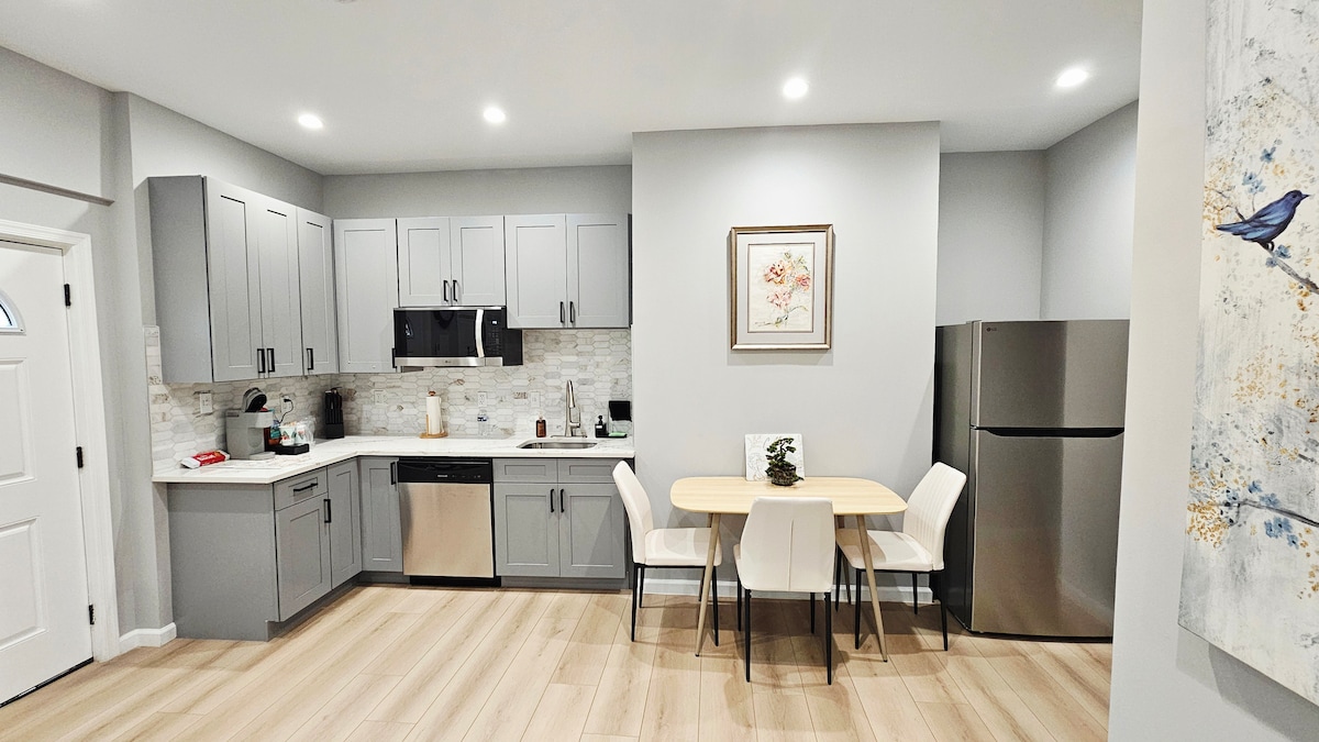 Private 1BR/1BA guest suite/apartment (600 sf) in a brand-new single-family home. The guest suite is located on the upper level of the house and is accessible by elevator from the mudroom when you enter through the front porch. It feels like a private one-bedroom apartment, complete w a cozy living area, a bedroom, and a kitchen. The kitchen is fully equipped with a full-size refrigerator, dishwasher, microwave, countertop electric burner, coffee maker, kettle, utensils, plates, cups, glasses.