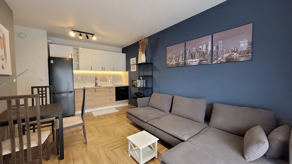 Nowoczesne 2-pokojowe mieszkanie 40 m² z parkingiem przy budynku. Jasny salon z aneksem kuchennym i wyjściem na taras, narożnikiem, stolikiem kawowym i stołem. Aneks w pełni wyposażony w sprzęt AGD. Dwa pokoje z łóżkami 140 cm i wygodnymi materacami. Łazienka z prysznicem, umywalką, toaletą i szafkami. W przedpokoju zabudowa z pralką i szafą. Rolety antywłamaniowe w oknach. Dla 1–5 osób. Blisko Wrocławia, parku, sklepów, komunikacji i tras.