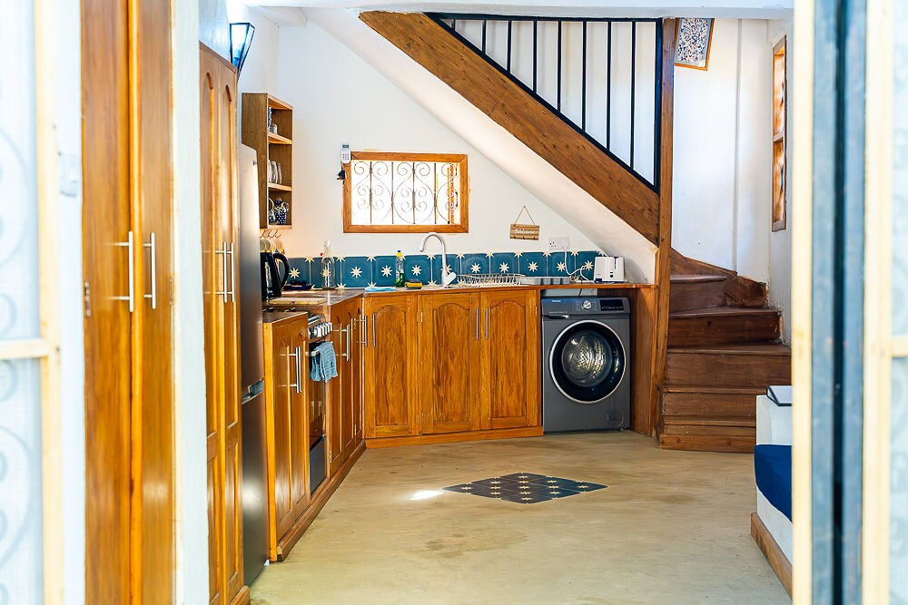 This Swahili styled cottage is accessed through a private courtyard in bustling Bagamoyo old town. There's a well equipped kitchen and downstairs toilet on the ground floor and a double bedroom on the first floor with a tiny bathroom. The open roof-top lounge on the second floor is a wonderful place to relax and and it offers a spectacular view of the sun-set most evenings. The cottage is conveniently situated, only a 5 minutes walk away from the beach, popular cafes and art shops.